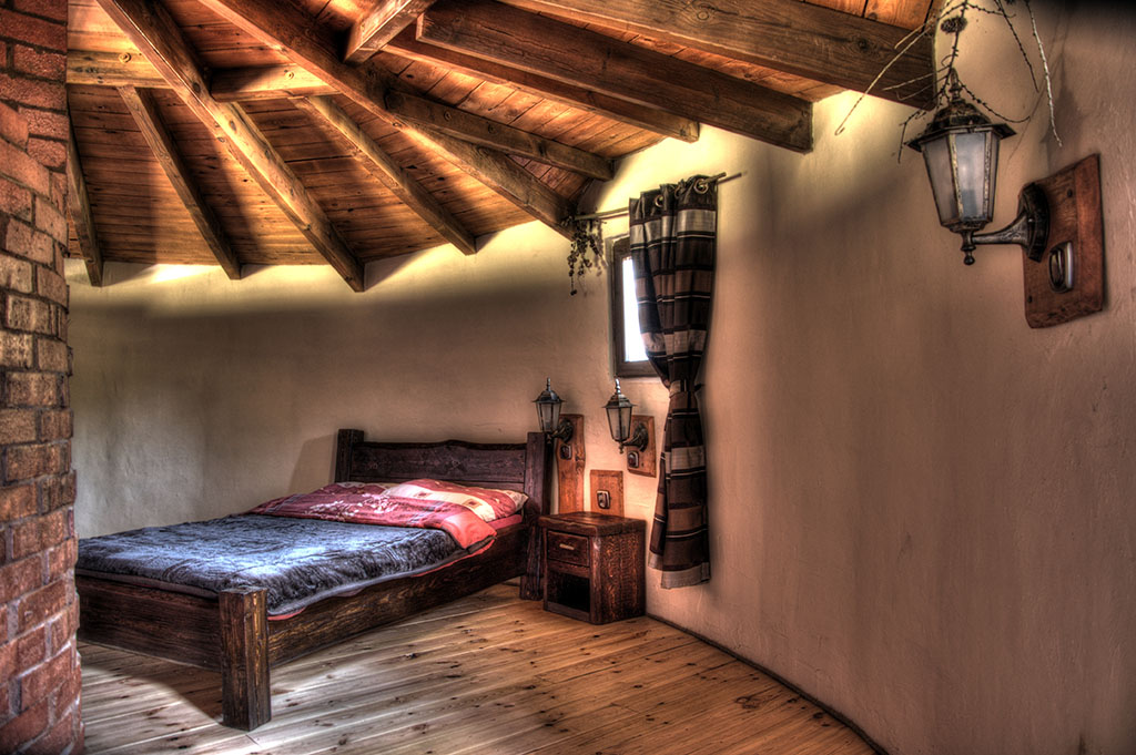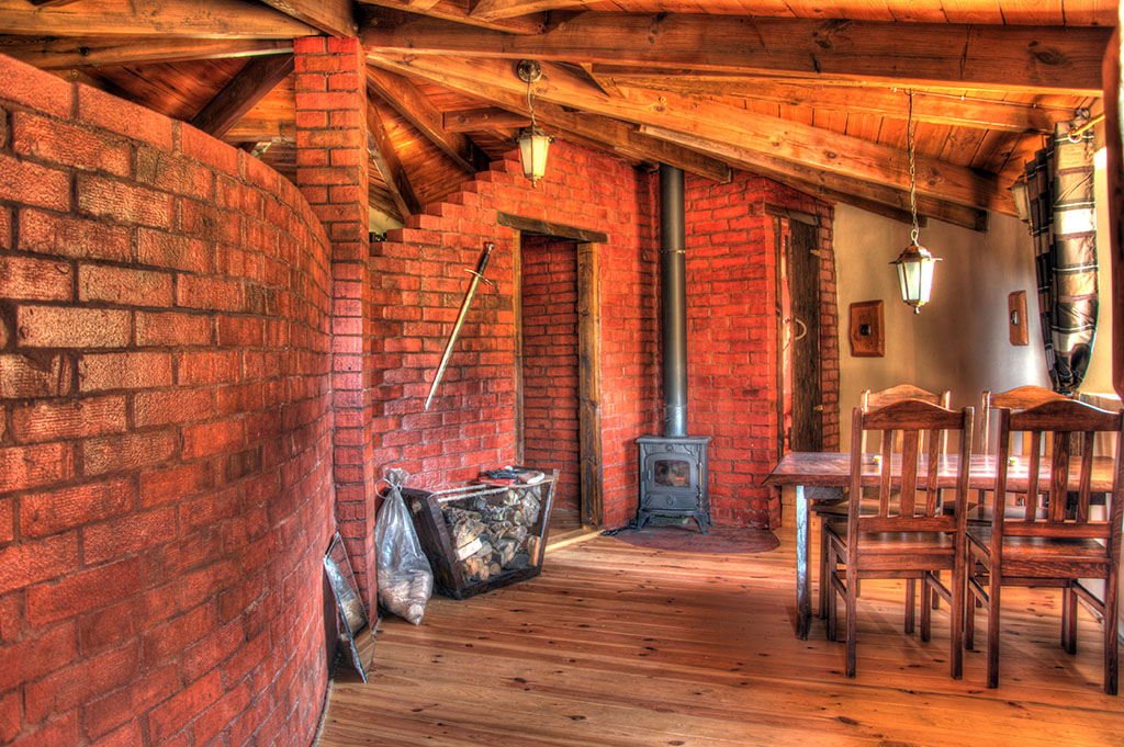 Wbrew przypuszczeniom jest to całkiem spora chatka posiadająca przedsionek, salon z kominkiem i łazienkę :). Salon jest duży, wygodny i umiarkowanie wysoki :). W salonie postawiliśmy mega wygodną sofę, dzięki czemu można walnąć się tam z książką i ściemniać gapiąc się w kominek. Wszystkie elementy wyposażenia domku (meble) zostały zrobione z litego drewna przez nas samych w Ośrodku.