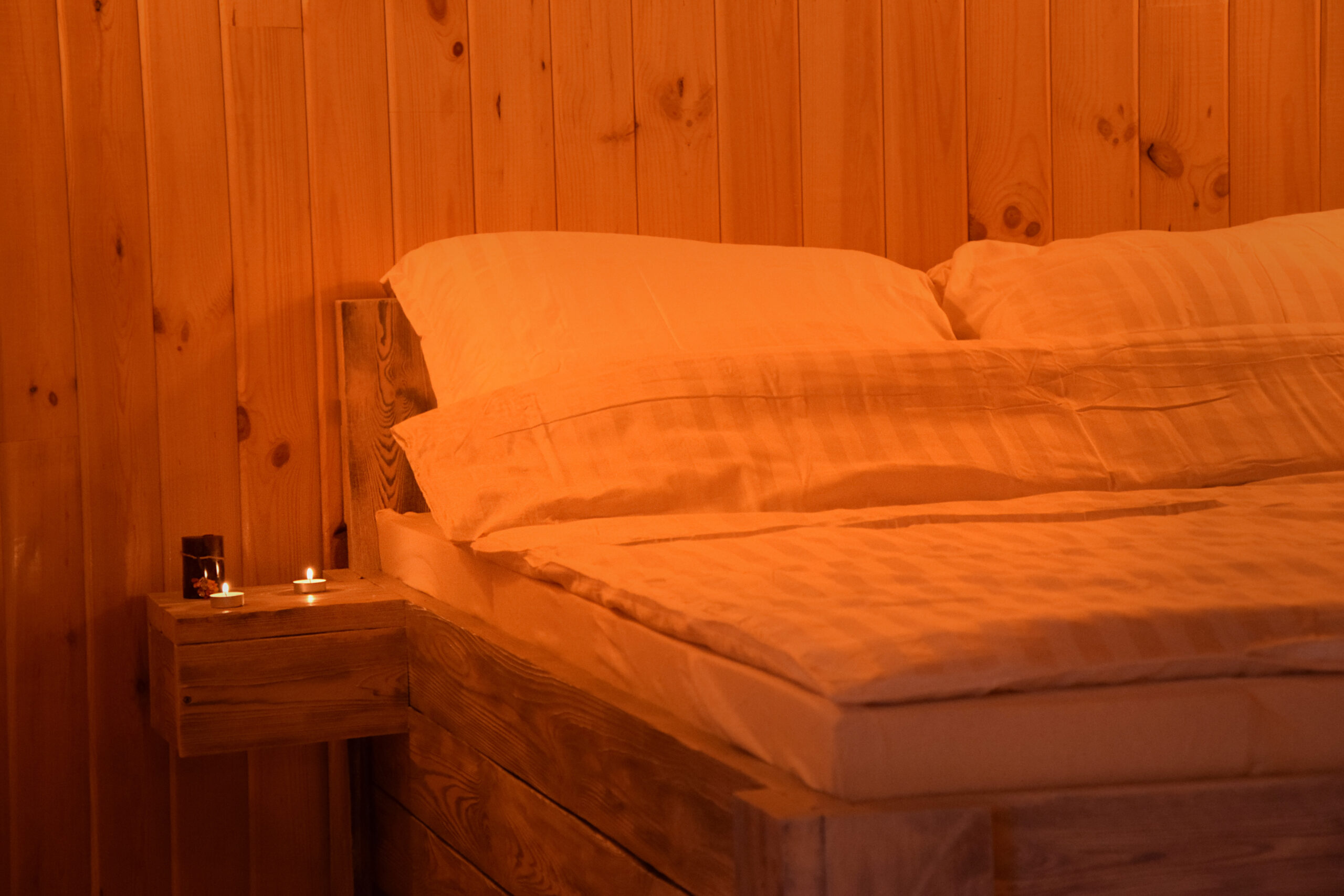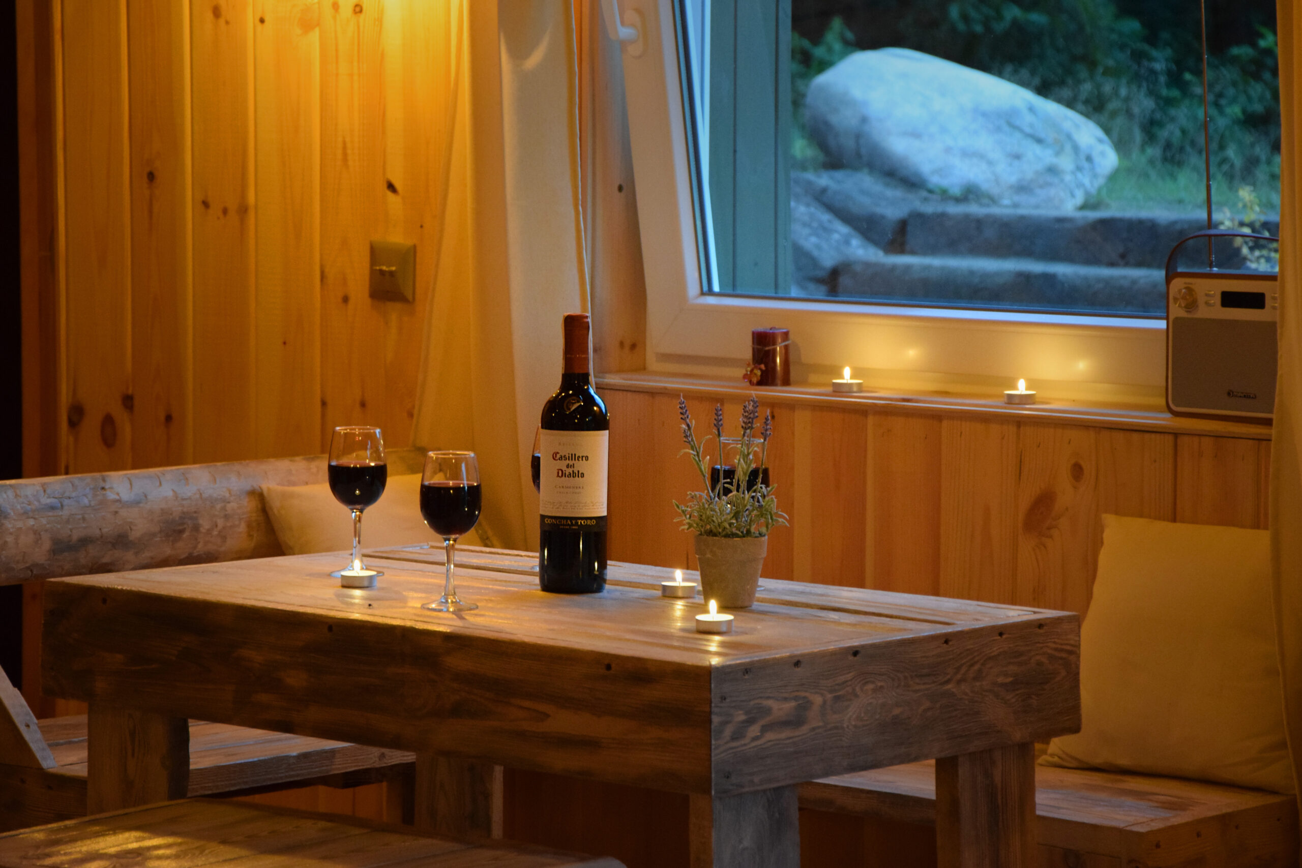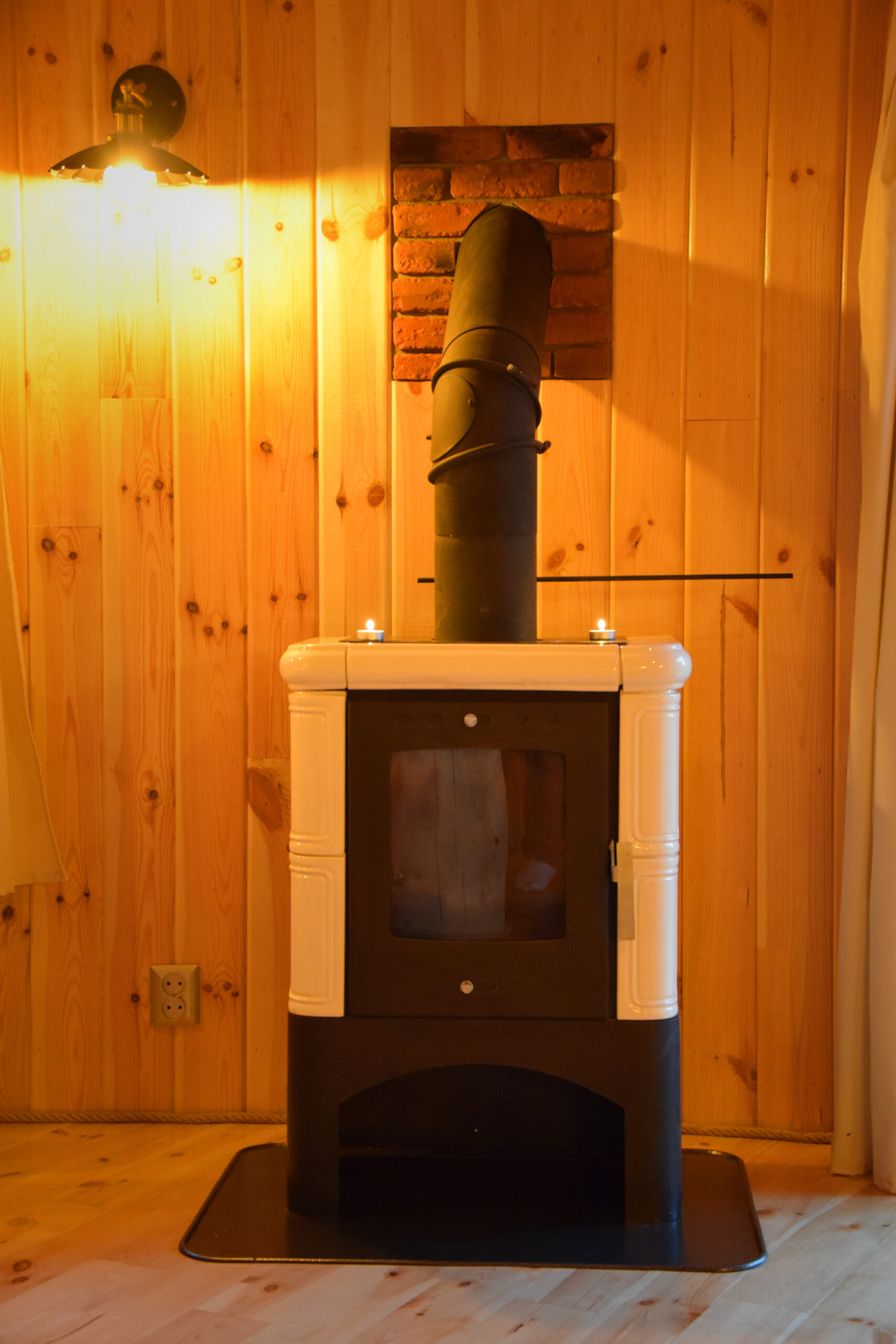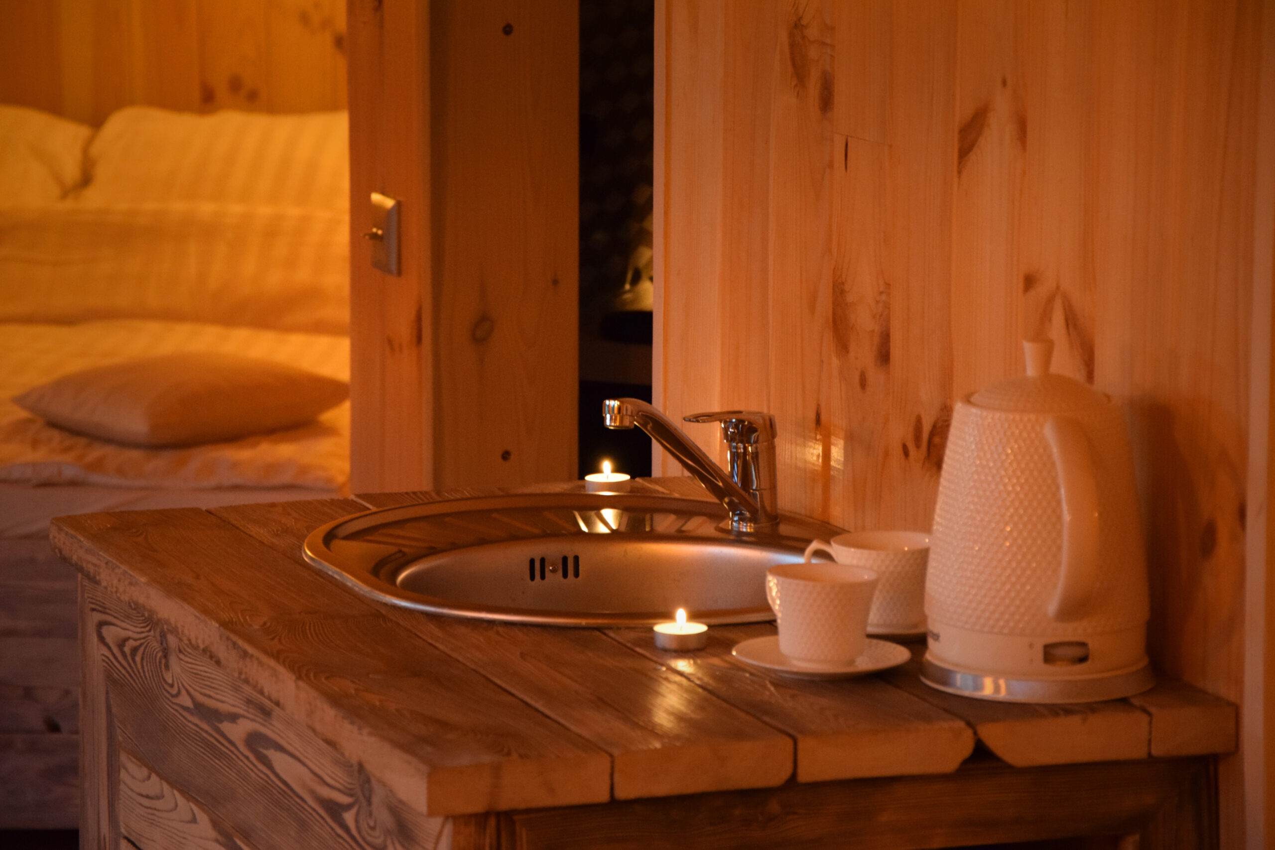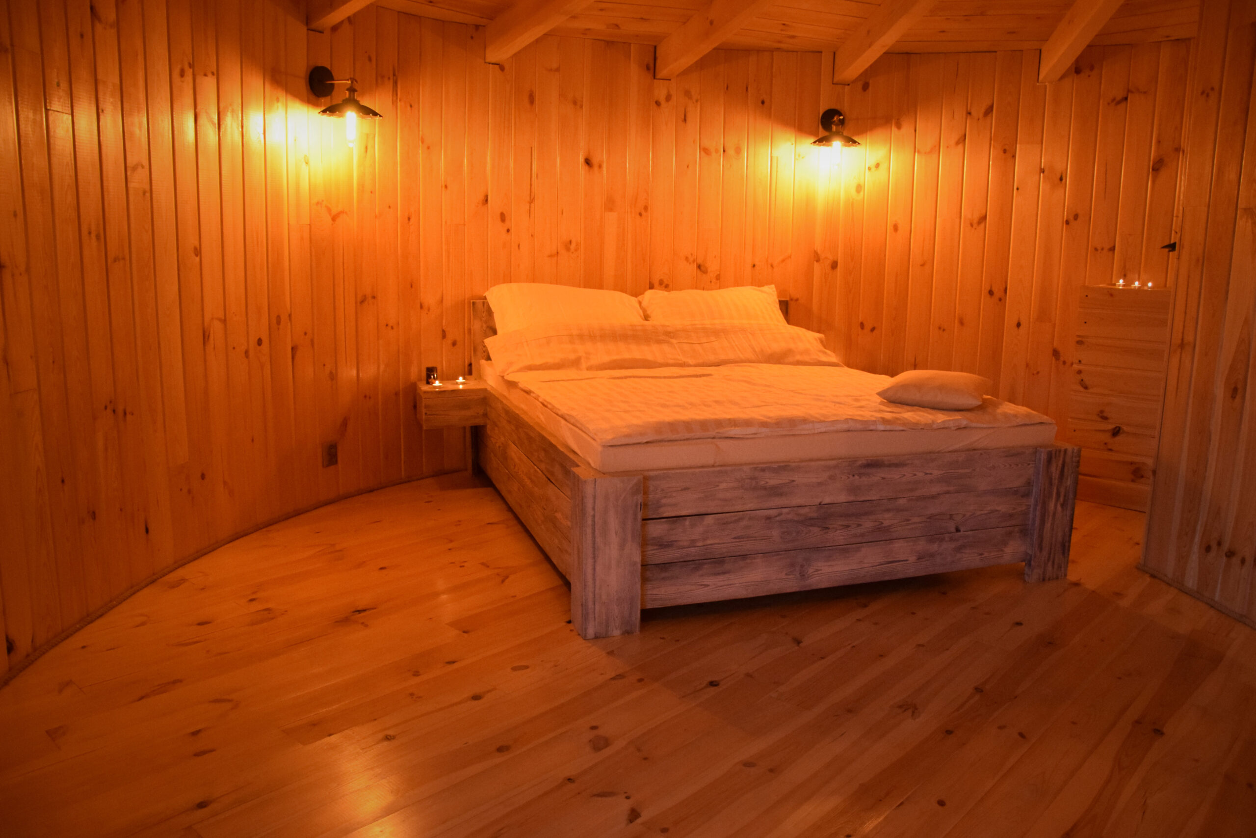 Najpiękniejsza, najjaśniejsza i najROMANTYCZNIEJSZA chata, jaką mamy w swojej stajni :). Zdecydowanie wyższy standard 🙂 – Salon z kominkiem, połączony w jedno z sypialnią i wielkim łożem małżeńskim, dodatkowy pokój dla dwóch osób oraz przepiękna łazienka! Oczywiście mikro aneksik z czajnikiem, lodóweczką i zlewem :). Ze względu na marzenie praktycznie każdego, że taka chata powinna mieć kominek z prawdziwego zdarzenia – tak zrobiliśmy :). Chata wyposażona jest w kominek na drewno! Można zrobić sobie naprawdę cieplutko :). Połączenie kominka z kaflami ceramicznymi „robi robotę” 🙂 ! Skład drewna przy domku (dąb, brzoza, sosna) zawsze do dyspozycji i pod ręką (nie wydzielamy drewna na sztuki 🙂 ) daje wiele komfortu i naprawdę nic nie zastąpi wieczorem lampki wina przy palącym się kominku. Ponadto trzeba koniecznie dodać, że chata, jak każda u nas, została zaprojektowana i zbudowana w taki sposób, żeby nasi goście mogli spać głową w kierunku północy , co zapewnia genialny sen. W Chacie „NIEDŹWIEDZICA” wstawiliśmy w salonie duuuże okno tarasowe, które pozwoli wyjść prosto na słoneczny trawnik, lub wybiec na przykład bezpośrednio z salonu w ulewę :). Za domkiem super wyizolowane miejsce na grilla, ławeczki  a w oddali pastwiska z końmi :). Poza tym pod pokrywą lekkiej ziemi na dachu i przy zastosowaniu bardzo nowoczesnych okien możemy Was zapewnić,  że w takiej ciszy jeszcze nie spaliście – oczywiście można usłyszeć trzask ognia w kominku, ale poza tym…. nic!