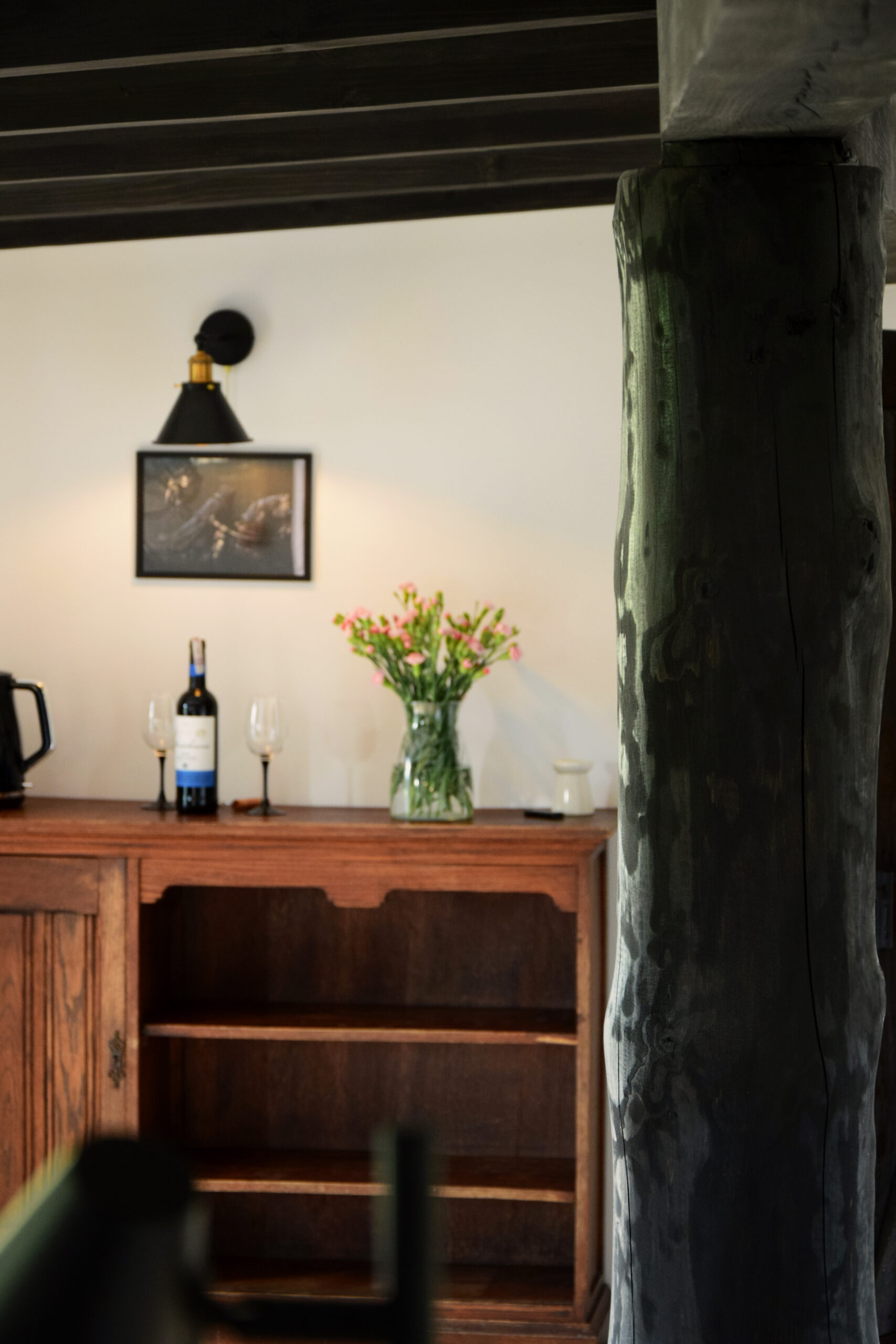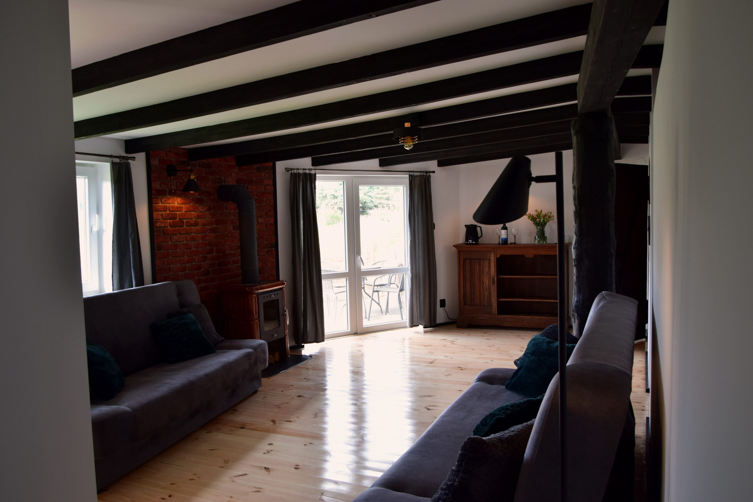 Ze względu na marzenie praktycznie każdego, że leśna chatka powinna mieć kominek z prawdziwego zdarzenia – tak zrobiliśmy :). Chatkę wyposażyliśmy w kominek na drewno! Można zrobić sobie naprawdę cieplutko :). Połączenie kominka z kaflami ceramicznymi „robi robotę” :)! Skład drewna przy domku (dąb, brzoza, sosna) zawsze do dyspozycji i pod ręką (nie wydzielamy drewna na sztuki :)) daje wiele komfortu i naprawdę nic nie zastąpi wieczorem lampki wina przy palącym się kominku.