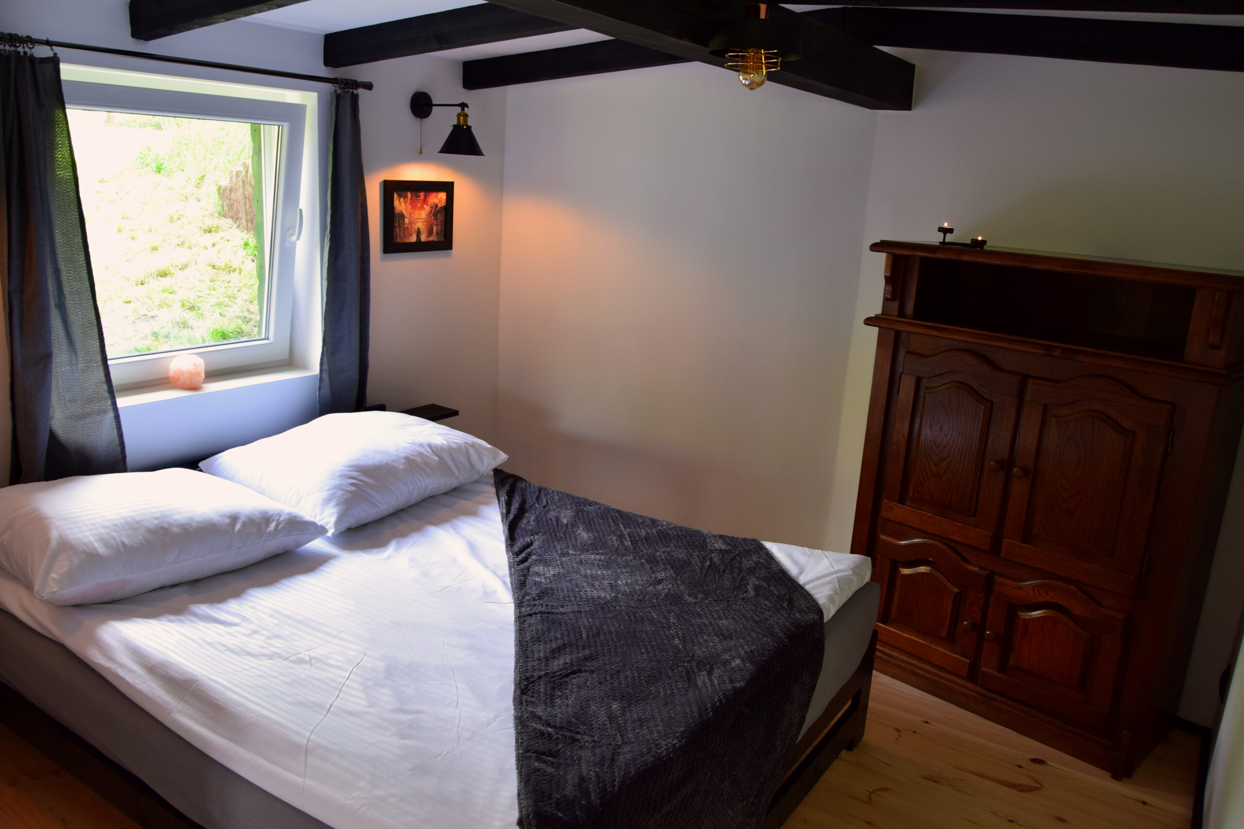Największa i już ostatnia z serii chatek w klimacie Baśni Hobbitowych. Jest w zupełnie innym klimacie niż pozostałe chatki. Duża, jasna, bardzo przestronna. DUŻY salon z kominkiem i dwiema wygodnymi kanapami, stolikiem oraz wygodnymi pufami, sypialnia usytuowana tak, żeby z łóżka było widać kominek oraz dodatkowy pokój z aż trzema łóżkami pojedynczymi. Oczywiście łazienka i taras wychodzący niemal bezpośrednio na pastwiska ze stadem koni :).
